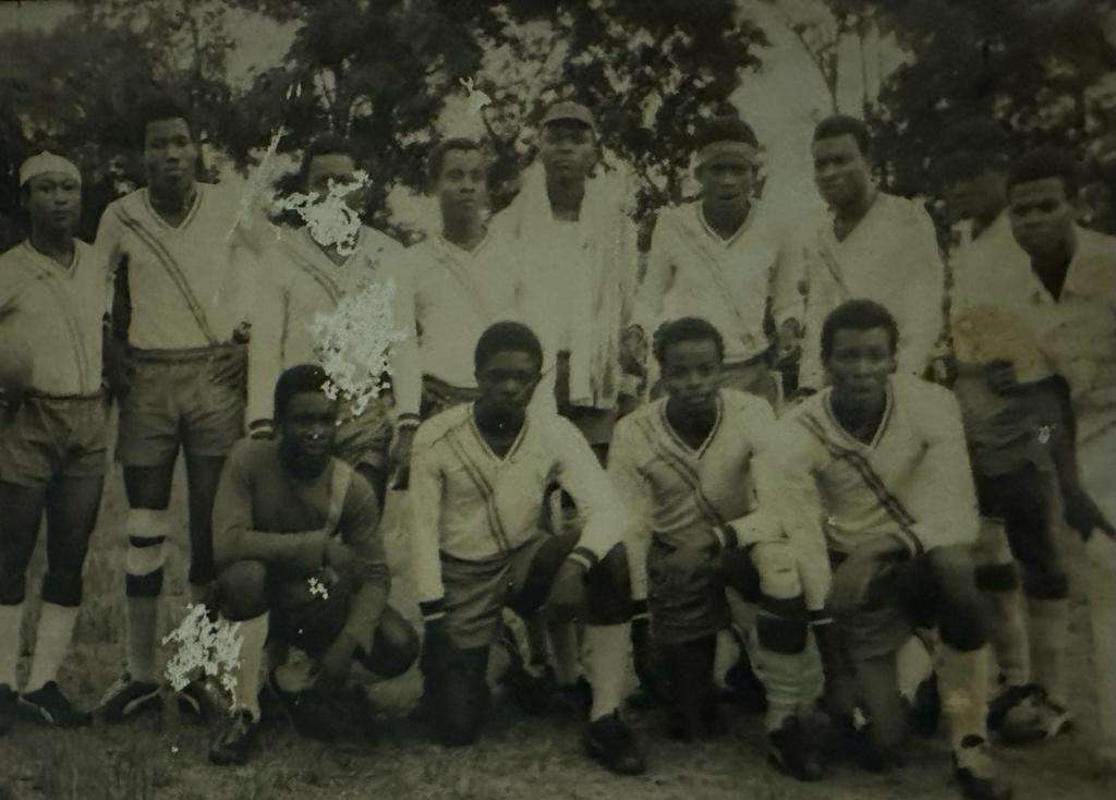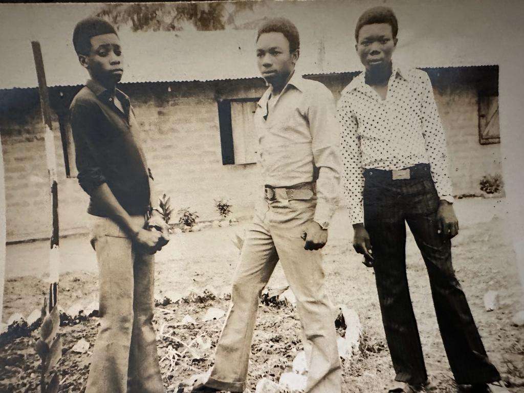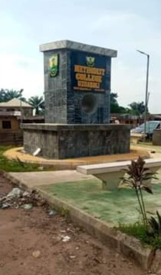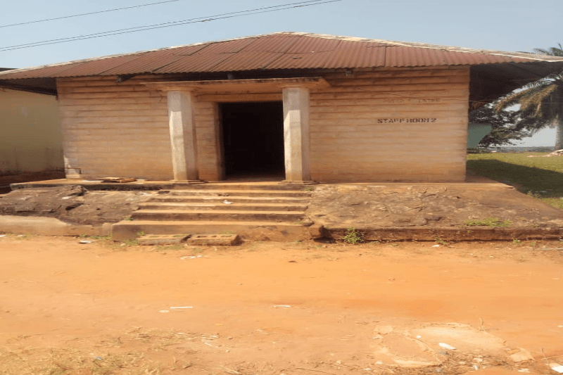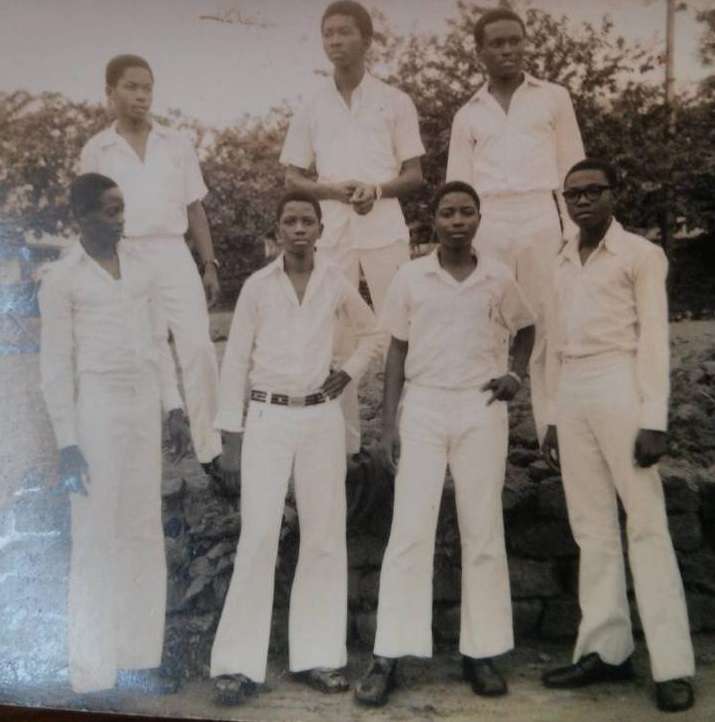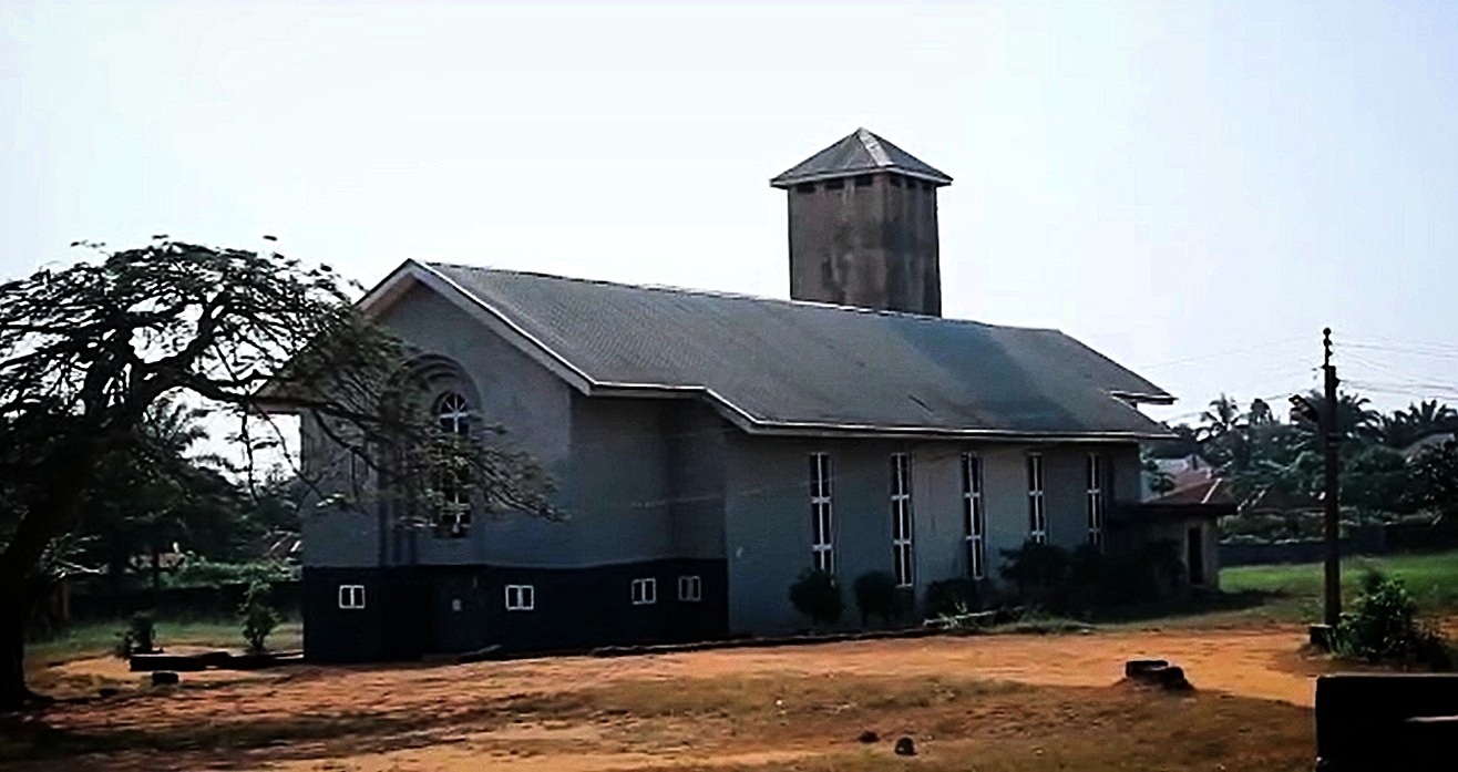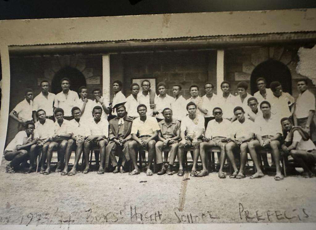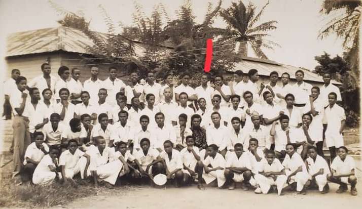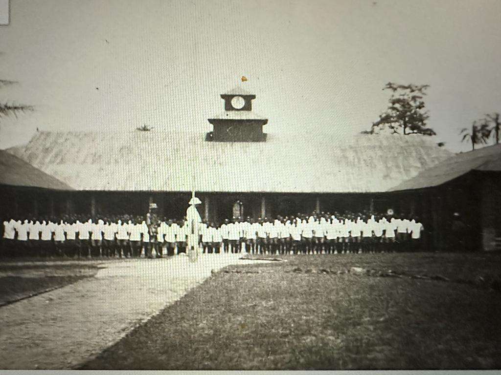 Black and white photograph of the town clock at Uzuakoli, in south-eastern Nigeria. The town clock was started at noon on 8th August 1934. Students of the Uzuakoli Institute (a training school started by the Church Missionary Society in 1932) stand to attention in front of the clock. Two instructors from the Uzuakoli Institute, Reverend H.L.O William and Mr. Murdock, can be seen in front of the students. The caption to this photograph reads: “Another view of same. Students assembled. Rev. H.L.O William & Mr. Murdock in the foreground.” This photograph was pasted into one of a series of exercise book albums created by Emily Godfrey, Matron of the Ama Achara Methodist Hospital, a medical facility in modern Abia state, southeast Nigeria, run by the Methodist Missionary Society.